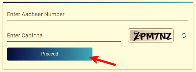 - अब आपके सामने एक डैशबोर्ड ओपन होगा जिसमे आपको Enter Aadhaar Number में अपना 12 अंक का आधार नंबर भरना है और Enter Captcha में सामने दिया गया कैप्चा कोड भरना है और Proceed पर क्लिक कर देना है।
