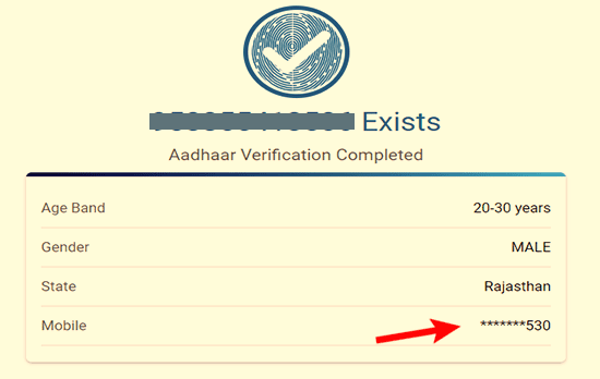 यहाँ security के लिए मोबाइल नंबर पूरा नहीं दिखाया जाता है सिर्फ मोबाइल नंबर के अंतिम तीन डिजिट ही दिखाए जाते है और पहले 7 अंक पर क्रॉस मार्क होता है। लास्ट 3 डिजिट नंबर हीं काफी है यह पता लगाने के लिए आपके आधार कार्ड से कौन सा मोबाइल नंबर जोड़ा गया है।