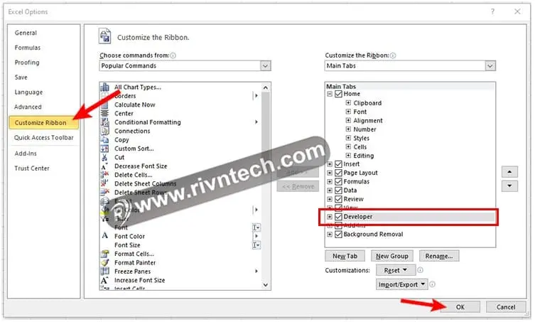 Options पर क्लिक करते ही Excel option डायलॉग बॉक्स open हो जाएगा जिसमे आपको Customize Ribbon के ऑप्शन पर क्लिक करना है। अब इसके बाद दाई ओर मुख्य टैब पैनल के अंदर Developer ऑप्शन को सेलेक्ट करना है जैसा की आप स्क्रीनशॉट में देख सकते है। अब OK पर क्लिक करते ही Developer Tab Ribbon में दिखाई देने लगेगा।