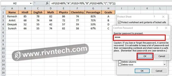 Protect Sheet के ऑप्शन पर क्लिक करते ही Protect Sheet नाम का एक बॉक्स स्क्रीन पर दिखाई देगा जिसमे आपको एक पासवर्ड टाइप करना है और OK पर क्लिक कर देना है।