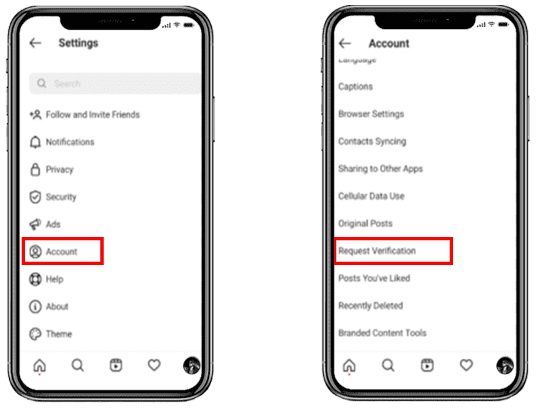 - Setting के ऑप्शन पर क्लिक करने के बाद आपको Account के ऑप्शन पर क्लिक करना है। इसके बाद आपको Request Verification के ऑप्शन पर क्लिक करना है।
