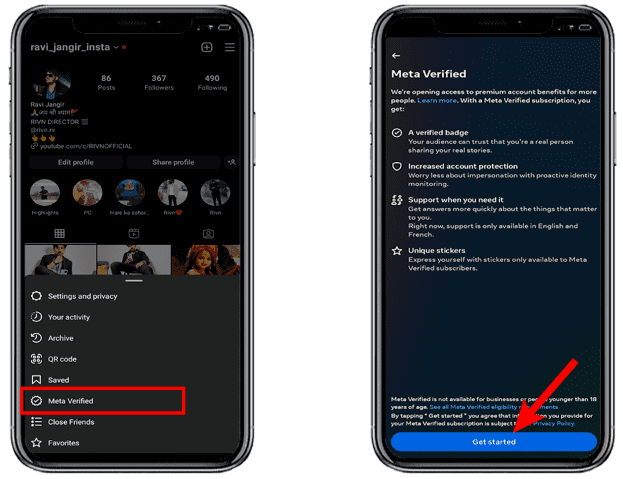 - अब यहा पर आपको Meta Verified का ऑप्शन दिखाई देगा उस पर click कर दे। इसके बाद एक पेज open होगा उसमे Get Started पर click कर दे।