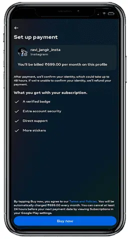 India में आपको Instagram blue tick के लिए 699 रूपये प्रति माह देने होगे। आपको हर माह इस राशि को Pay करना होगा।