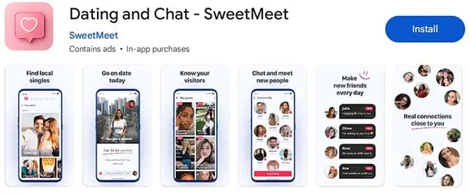 Dating and Chat – SweetMeet App लड़की पटाने वाले ऐप्स में बहुत ही शानदार ऐप है। यह एक काफी पॉपुलर चैटिंग और डेटिंग ऐप है।यह ऐप आपको लड़की पटाने के साथ-साथ लड़कियों से बातें करने की भी सुविधा देता है। अगर आप लड़की को पटा लेते है तो उससे बात भी कर सकते है।