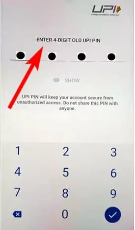- इसके बाद Enter OLD UPI PIN में आपको अपना पुराना 4 या 6 अंको का UPI PIN डालना जैसा की आप स्क्रीनशॉट में देख सकते है।