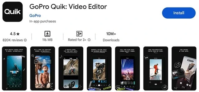 इस ऐप में कई सरे फीचर है, जैसे – add photo, music, Themes, videos text, trim shots manually, auto sync to music, Stickers, filters, text fonts, video editing styles आदि। GoPro Quik app को आप प्ले स्टोर से फ्री में डाउनलोड कर सकते है।