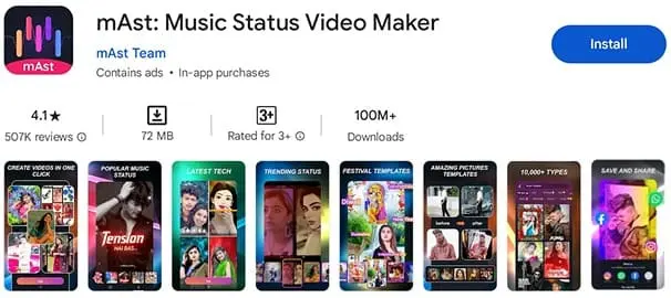 इस app का इस्तेमाल आप Lyrical Video Status, Festival Video Status, Anniversary Photo Status, Happy birthday Video Status, Magical Video Status, और Master Video Status बनाने के लिए कर सकते है। mAst app प्ले स्टोर पर उपलब्ध जहाँ से आप इसे डाउनलोड कर सकते है।