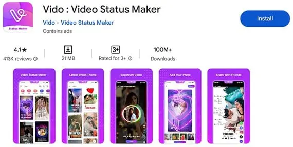 Vido एक पॉपुलर photo se video banane wala app with song है, इस बात का अंदाजा आप इस app के downloads और reviews को देखकर लगा सकते हैं। Vido एक Lyrical Video Status Maker app है जो फोटो का वीडियो बनाने में मदद करता है।