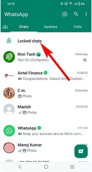 - अब आप जैसे ही Chats section में वापस आएगे तो आपको सबसे ऊपर Locked chats का ऑप्शन दिखाई देगा जिसमे आपके द्वारा लॉक की गई चैट है।