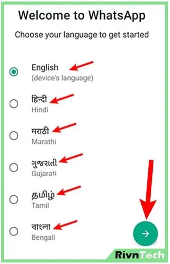 अब आपको whatsapp को open कर लेना है, जिसमे आपको कुछ इस तरह का interface दिखाई देगा। इसमें आप जो भी भाषा whatsapp में use करना चाहते है उसे सेलेक्ट करना है और उसके बाद arrow के बटन पर क्लिक कर देना है।