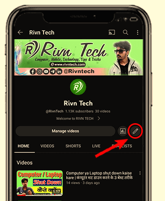 - अब आप अपने चैनल के होम पेज पर चले जाएंगे। यहाँ पर आपको Channel Name के नीचे एक साइड में एडिट आइकॉन दिखाई देगा जैसे आपको स्क्रीनशॉट में दिख रहा है। आपको उस एडिट आइकॉन पर क्लिक करना है।